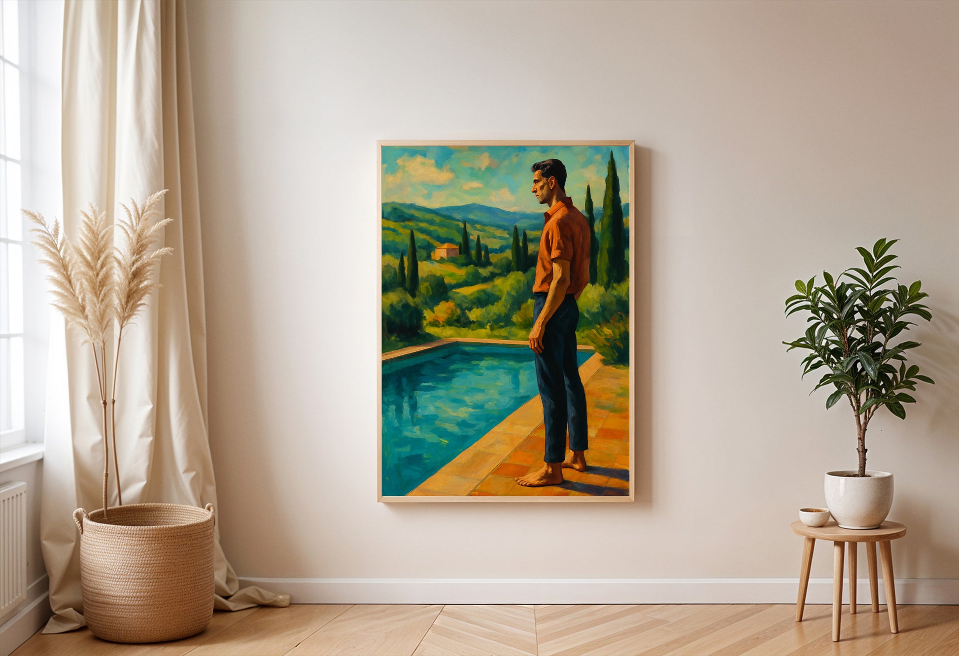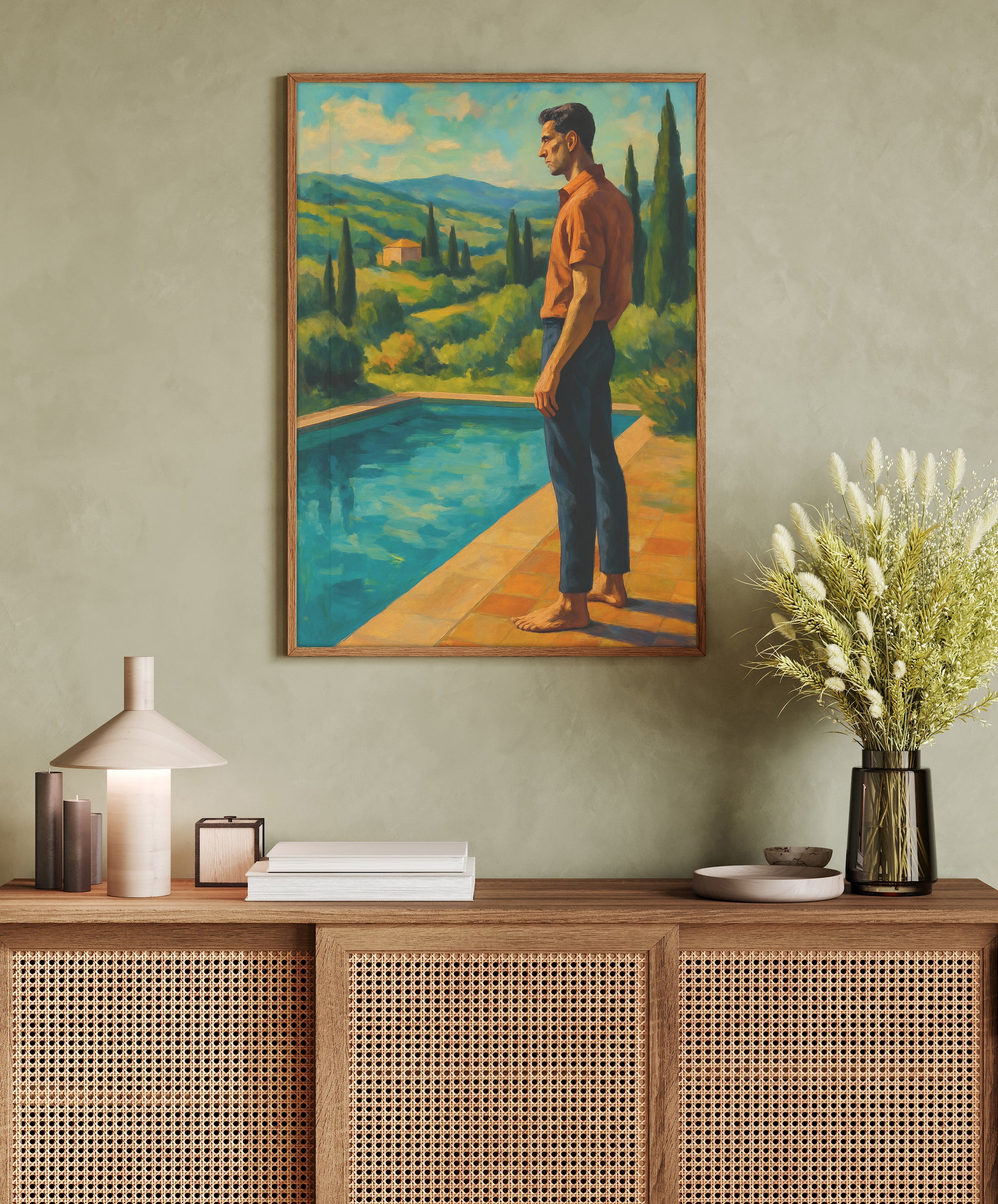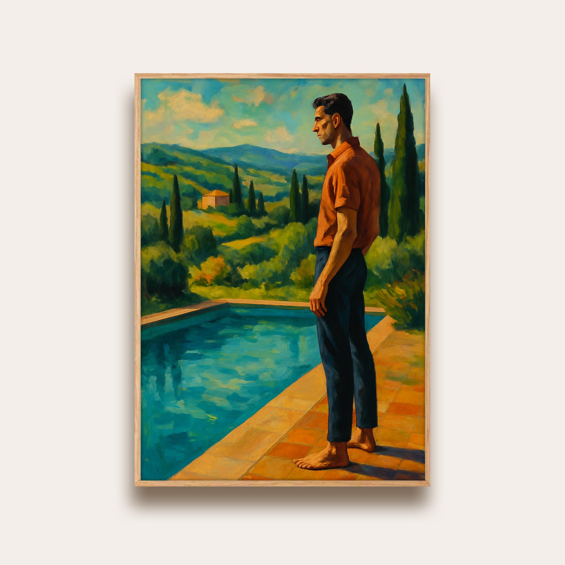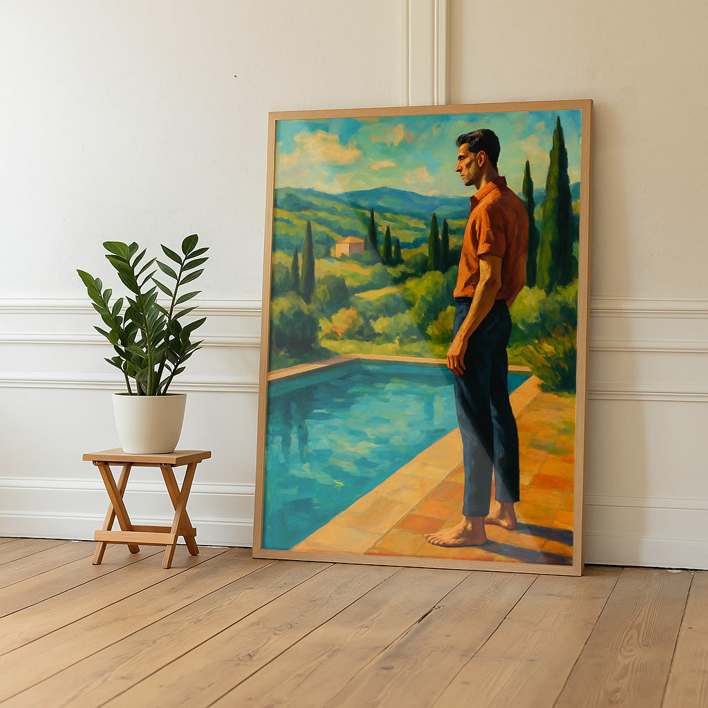 Sophistication meets serenity — this poster captures a tall, classic Italian gentleman standing by a pool, gazing out over the breathtaking Italian landscape. A scene of quiet elegance and timeless style, it evokes la dolce vita at its finest.